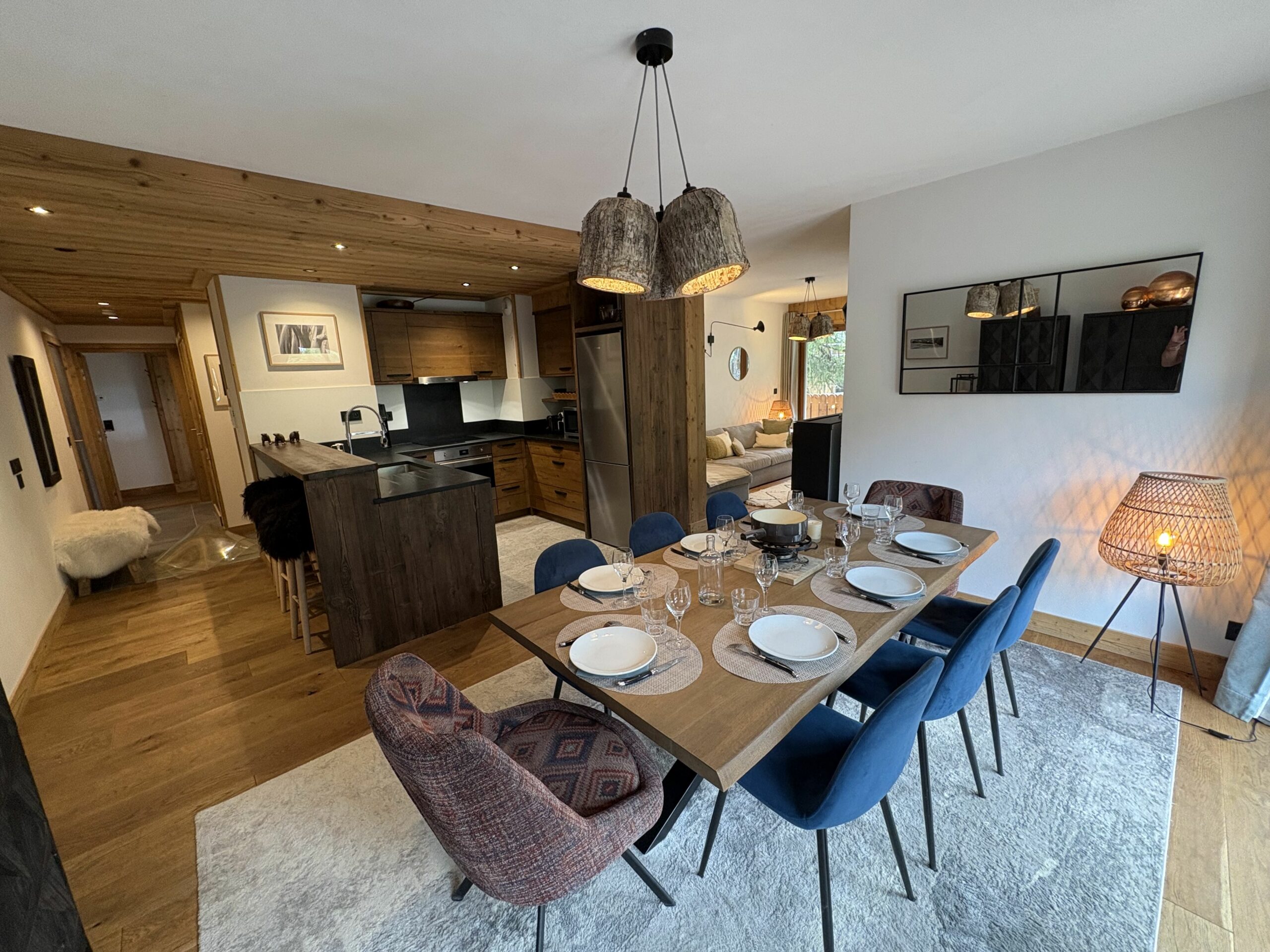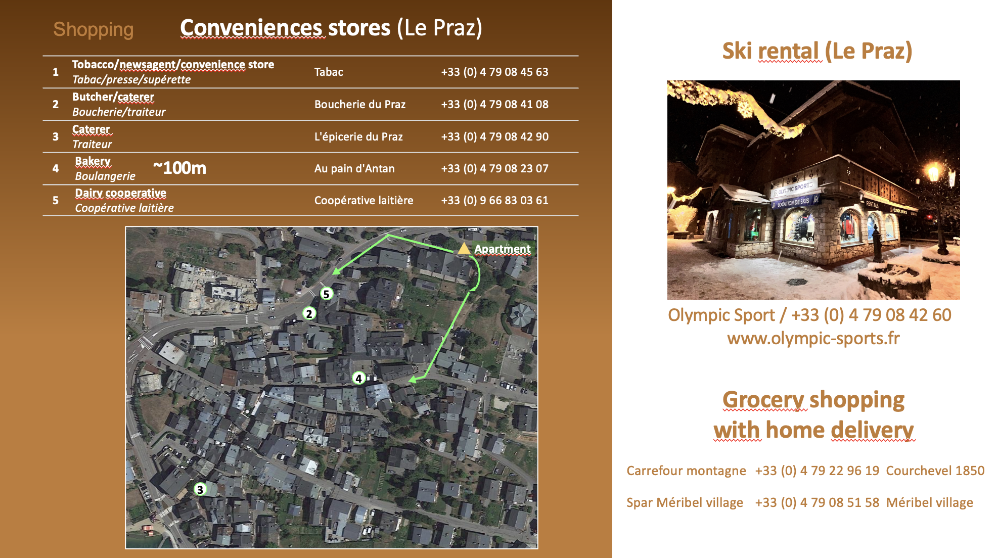 The apartment is located just a few steps from the center of the village of Le Praz (Courchevel 1300), 5-minutes walk from the ski lessons and ski lifts leading to Courchevel 1850 (operating from 7:45 AM to 11:30 PM) and to the top of Méribel (Col de la Loze).